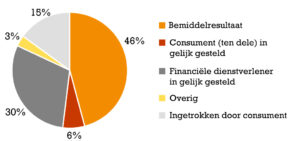 Het aantal klachten dat is opgelost via bemiddeling of schikking is met 46% in 2020 op hetzelfde niveau gebleven als in 2019. Kijkend naar het totaal aantal bemiddelresultaten doen banken, verzekeraars en financiële adviseurs (intermediair) niet onder voor elkaar als het gaat om medewerking aan het vinden van een oplossing via bemiddeling of schikking. Van de 1.481 klachtzaken waarin bemiddeling of schikking is gelukt, betreft het voor 30% schadeverzekeringen, voor 15% levensverzekeringen, voor 29% bank- en hypotheekzaken en voor 25% klachten tegen financiële intermediairs