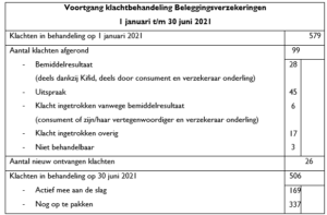 Kifid blijft voortvarend aan de slag met het behandelen en afronden van beleggingsverzekeringsklachten. In het eerste halfjaar van 2021 hebben opnieuw 99 consumenten duidelijkheid gekregen over hun beleggingsverzekeringsklacht. Voor een op drie van deze klachten is door bemiddeling een oplossing gevonden. Dit tot tevredenheid van zowel de consument als de verzekeraar. Daarbij zijn partijen in enkele zaken er samen uitgekomen. In 45 klachtzaken heeft de Geschillencommissie uitspraak gedaan. Het afgelopen halfjaar ontving Kifid van 26 consumenten een nieuwe klacht over hun beleggingsverzekering. Dit maakt dat Kifid in totaal nog iets meer dan 500 van dit soort klachten in behandeling heeft.